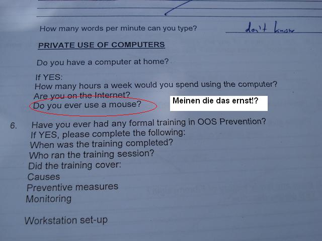 Ach ja, Nr. 2.: Hier noch zwei Pix. Das erste zeigt Fragen meines Bewerbungsbogens, den ich ausfuellen musste und das zweite zeigt die Leute, mit denen ich im Backpackers in Hastings rumhing.