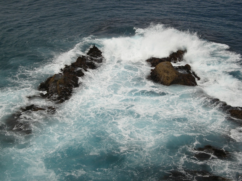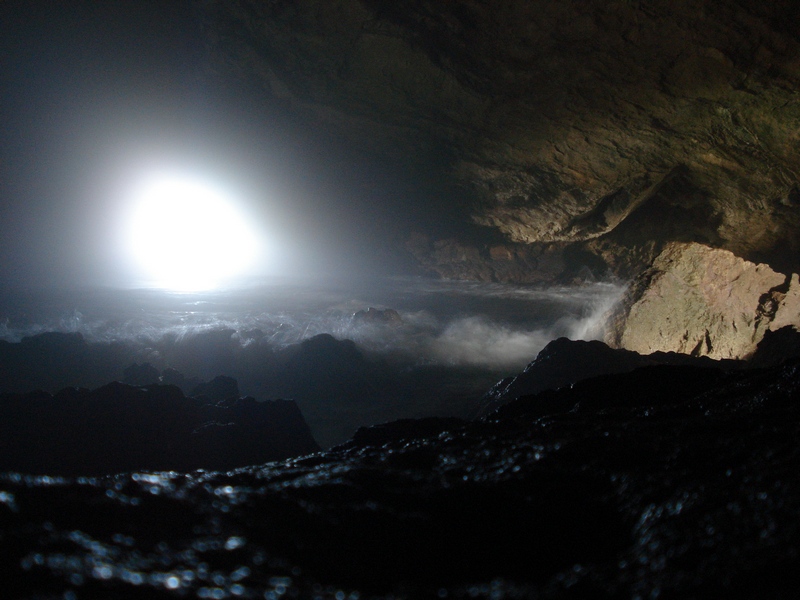 Sehr weit kam ich jedoch nicht: Ich konnte mich nur auf einer relativ kleinen, mit Löchern übersäten Platform bewegen, da riesige Brecher durch die Felsenkammer rasten. Bilder waren leider nur leidlich möglich, da die Luft mit feinen Salzwasswetropfen gesättig war, sodass Aufnahmen mit Blitz zu vollständig weißen Bildern führten.