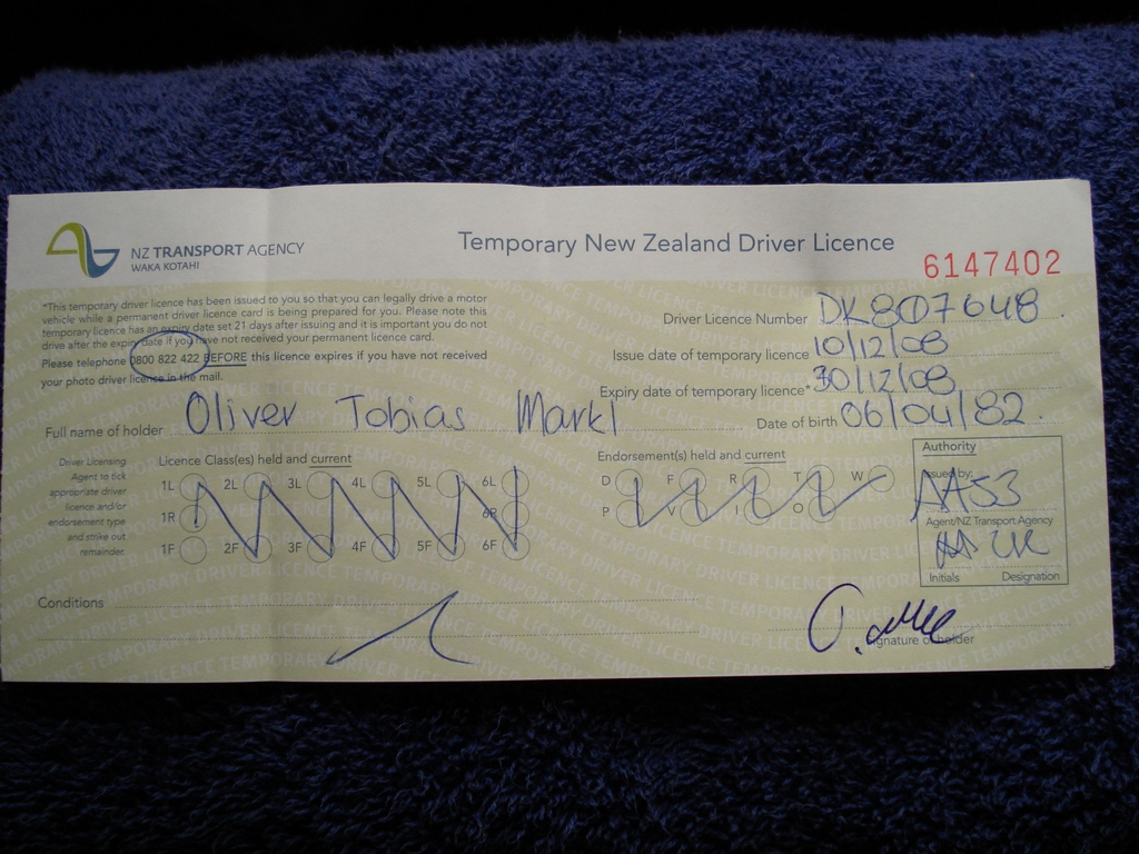 c) Habe vor wenigen Stunden meinen guten deutschen Fuehrerschein abgeben muessen! Nein, bin nicht zu schnell gefahren - nein, auch nicht bei Rot ueber die Ampel. Aber: Die verdammten deutschen Behoerden haben (jedenfalls laut Auskunft der Fuehrerscheinstelle AA in Napier und der offiziellen Hotline der Land Transport NZ) gefordert, dass jeder Deutsche, der einen Fuehrerschein in NZ erwirbt, seine deutsche Licence abgeben muss. Punkt. Dieser wird dann ungueltig gemacht und nach Deutschland ueberstellt. Toll. Habe der ganzen Sache zugestimmt, da ich sonst a) offiziell in NZ nicht mehr Autofahren darf und b) meine Haftpflichtversicherung fuer den Van um fast 200$ guenstiger wird.