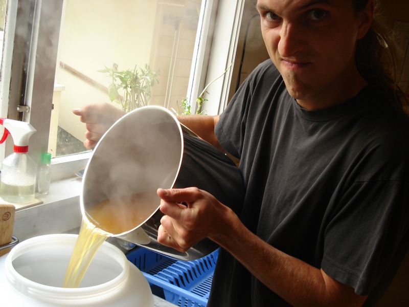 Unser Kunststoffgaerballon hatte allerdings nicht lange Zeit, um Staub anzusetzen. Seit gut drei Tagen reifen nun 23 l (hoffentlich) koestlichen Mets heran. Haben uns die staerksten Hefen im lokalen Braushop gekauft und den guten Trunk auf 17% Alkohol angesetzt - staerker ist ohne Destillation nicht moeglich. Wobei wir streng genommen keinen reinen Met produzieren, da wir noch ne gute Menge Apfelsaft zugesetzt haben, um den gefraessigen Hefen mehr Nahrung in Form von Phosphorverbindungen etc. zu bieten. Ausserdem kamen knapp 10 kg (!) besten Biohonigs direkt vom Imker zum Einsatz - gute Connections sind schon was wert.