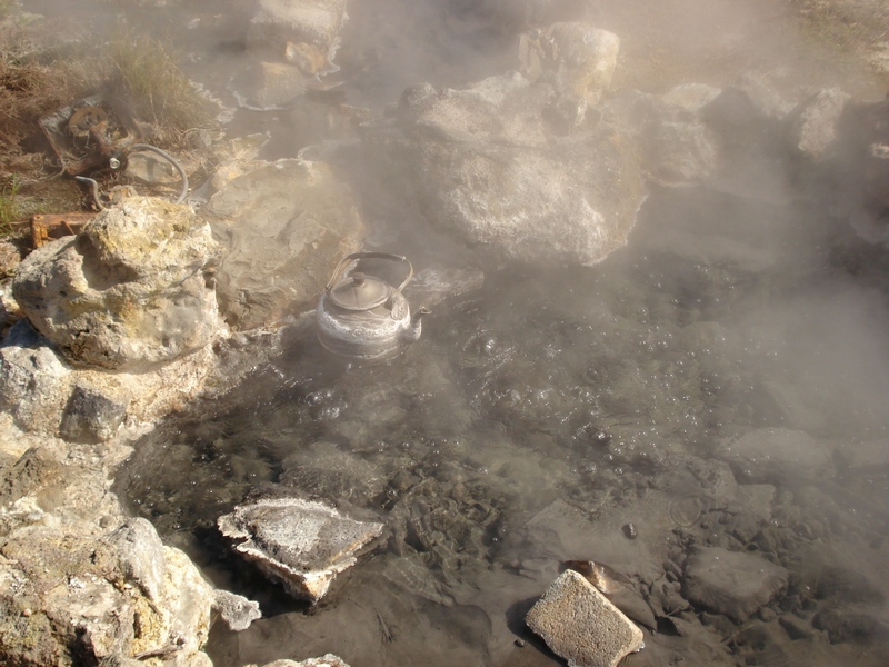 dampfende Gullideckel, blubbernde Schlammpfuhle, Teekessel, die in kochenden Pfuetzen vor sich hinbrodelten und von Schwefelsaeuredaempfen zerfressene Treppen, Pflastersteine und Mauerreste. Schee! Ausserdem stank es nach faulen Eiern - und zwar ueberall. Willkommen in Rotorua. Es war aber natuerlich auch Zeit fuer ein wenig Entspannung - wo sonst, wenn nicht in einer heissen Quelle am Wegesrand ...