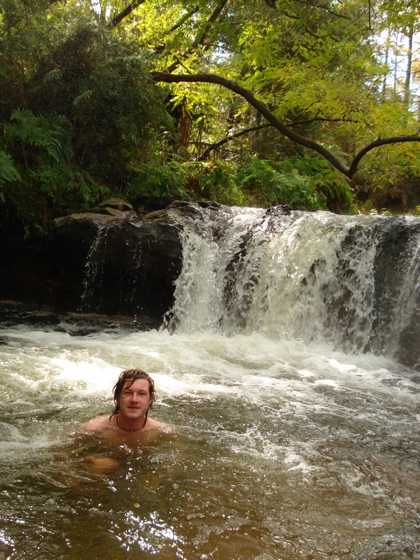 Als es dann richtig daemmerte, fuhren wir an unsere erste heisse Quelle - kannte die ziemlich versteckte Location von meinem ersten East Cape Trip vor 15 Monaten (Mann, bin ich schon lange hier). Leider war es ziemlich finster als wir ankamen. Trotzdem war es aber offensichtlich, dass der schoene Flusslauf ziemlich umgestaltet worden war: Betonsteine zur Begrenzung, kuenstliche Waelle, um das Wasser aufzustauen. Ihh! Nicht mehr schoen - aber wenigstens immer noch schoen heiss. Konnte keine Fotos aufnehmen, habe hier aber ein altes Bild angefuegt, um euch zu vermitteln, wie es hier einmal aussah.